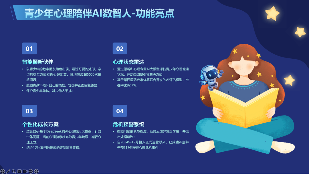 并吞自研AI心扉期骗大模子,针对个体问题和现时心扉健康状态为青少年提供定制指引策略。