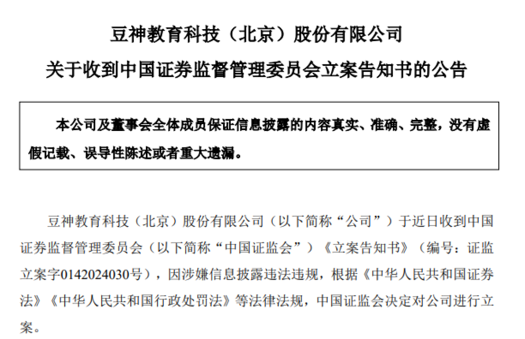 12月20日,豆神证实(300010)公告称,其因涉嫌信息袒露坐法违法,于近日收到证监会的《立案讲述书》。
