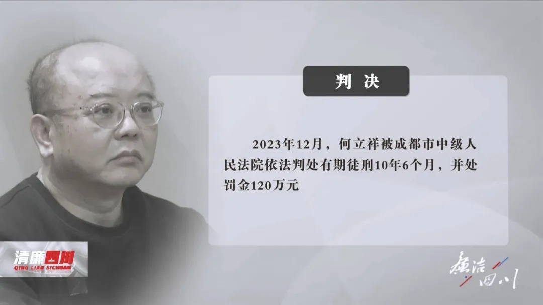 2023年6月,何立祥被开除党籍和公职。2023年12月,何立祥被成都市中级东谈主民法院照章判处有期徒刑10年6个月,并处罚款120万元。